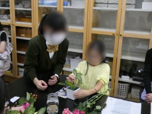 理科実験室で行われた華道部の体験講座では、花を生けることの楽しさ、日本文化のすばらしさを参加児童が感じ取れるよう、部員がマンツーマンできめ細やかにレクチャーをしていました。